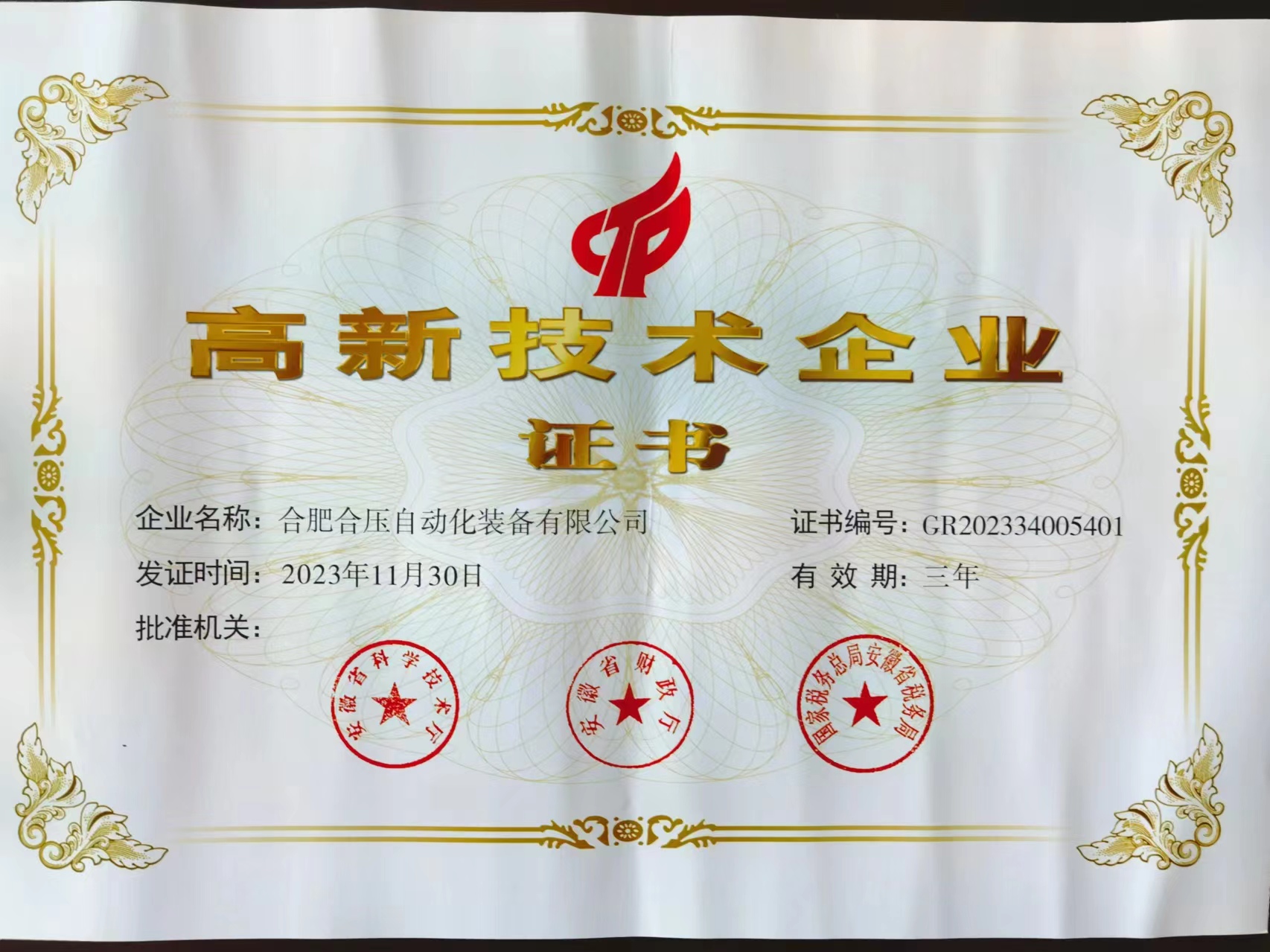 合肥合壓自動(dòng)化裝備有限公司是一家技術(shù)型公司,自成立以來(lái)追求以技術(shù)為核心,以客戶為中心,以品質(zhì)為根本,不惜代價(jià)力求完美,本次通過(guò)“國(guó)家級(jí)高新技術(shù)企業(yè)”和“國(guó)家級(jí)科技型中小企業(yè)”的認(rèn)定,是對(duì)公司的認(rèn)可和肯定。