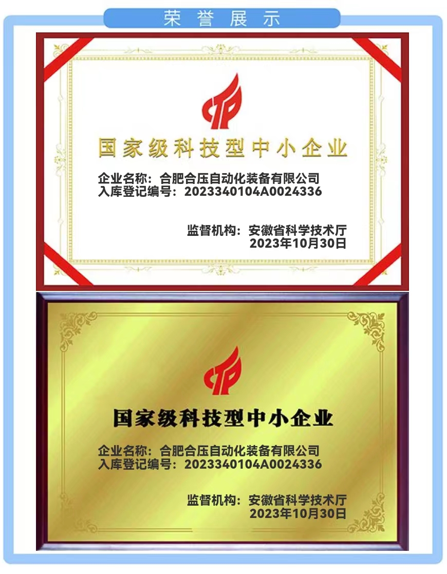 合肥合壓自動(dòng)化裝備有限公司榮獲“國(guó)家級(jí)高新技術(shù)企業(yè)”和“國(guó)家級(jí)科技型中小企業(yè)”